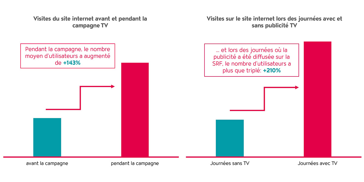 Le changement dans la préférence du canal d’achat pour les produits à base de chanvre s’est également reflété au niveau de la boutique en ligne de cbuy.ch. Les visites du site Internet ont considérablement augmenté pendant la campagne et en particulier pendant les jours de diffusion des spots. Les jours où la publicité TV était diffusée sur SRF, le nombre de visites du site web était trois fois plus élevé (+210% d’utilisateurs) que les jours où la publicité TV n’était pas diffusée (voir ill. 2).