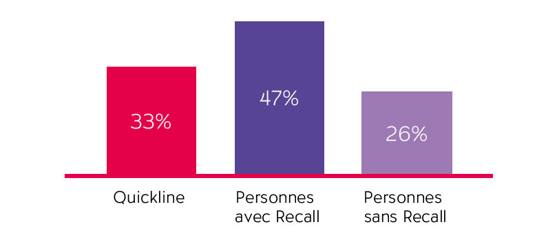 La publicité TV a également permis d’accroître significativement la sympathie de la marque. La part de personnes trouvant Quickline plutôt ou très sympathique passe ainsi de 21% à 33% – soit une progression de près de 60%. Parmi les personnes qui se souviennent du spot TV, cette valeur passe même de 33% à 47%, un excellent résultat.