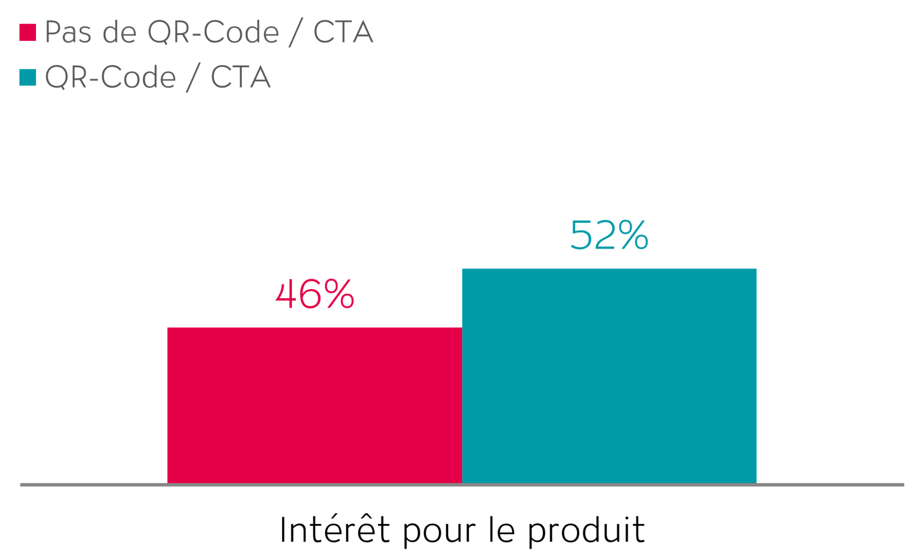 - Les valeurs de mémorisation sont restées inchangées dans les groupes test correspondants, mais l’intérêt pour le produit augmente nettement grâce à l’utilisation d’éléments interactifs (+4,3%).