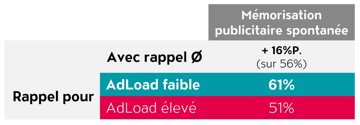 - La mémorisation libre (rappel sans aide) est 37% plus élevée avec un AdLoad faible (+10 points de pourcentage) que pour les blocs publicitaires longs.