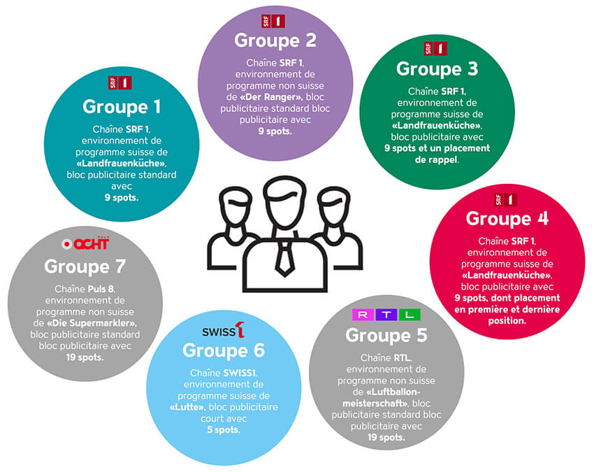 Afin de déterminer l’impact d’un spot reminder, la configuration du groupe 1 (chaîne SRF avec environnement de programme suisse) a été reprise pour le groupe 3. En revanche, dans le groupe 3, le spot de 20 secondes présenté en 4e position était répété dans une version de 12 secondes en 6e position.