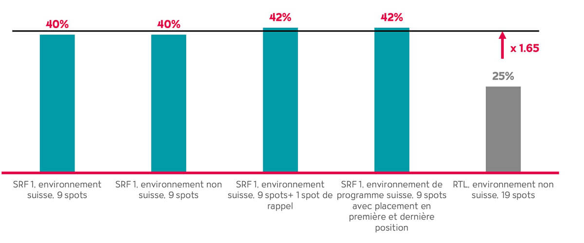 Il apparaît néanmoins que les spots à la forte identité suisse placés dans un environnement de programme suisse atteignent un recall moyen de 43%, soit 1,11 fois mieux que dans un environnement non suisse (38% de recall). Certains indices montrent donc qu’environnement de programme et créations de spots peuvent se soutenir mutuellement.