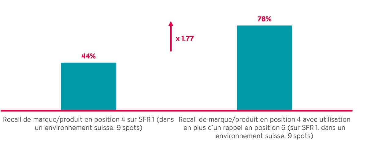 Outre l’environnement de chaîne et le spot reminder, les placements en première et dernière position se sont avérés efficaces pour l’effet de mémorisation dans le groupe 4. Avec le placement en première position, la valeur de recall augmente selon un facteur 1,11. Avec le placement en dernière position, le recall grimpe même selon un facteur 1,5.