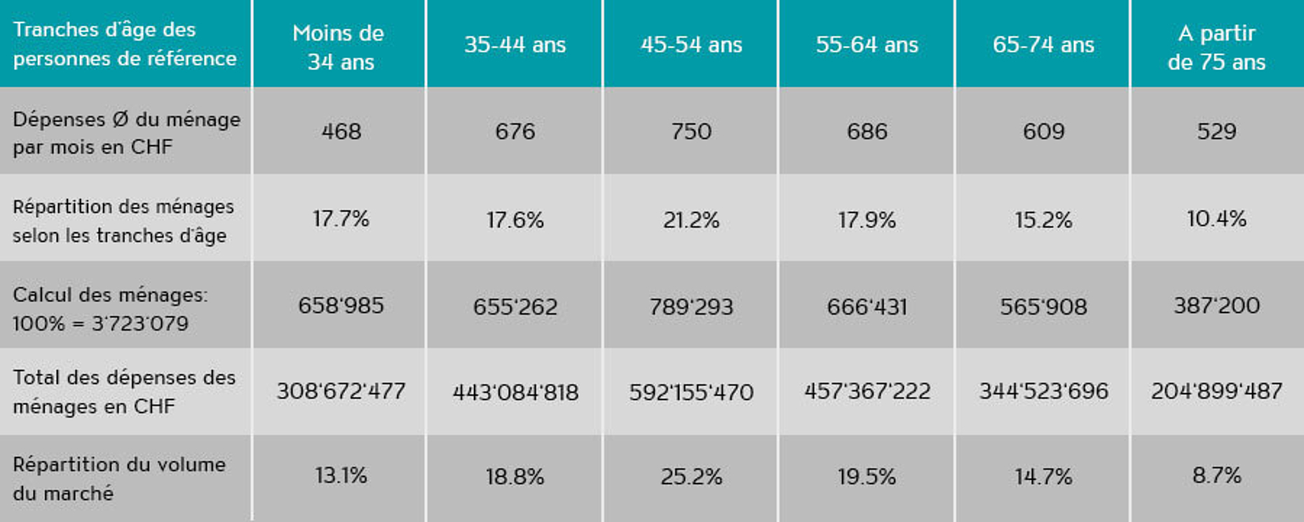 Dans le cadre de l’enquête sur le budget des ménages, l’Office fédéral de la statistique (OFS) détermine les dépenses budgétaires mensuelles moyennes des ménages suisses. L’enquête souligne l’importance des ménages composés de personnes de référence âgées de 45 à 64 ans. En effet, une grande partie du volume du marché de nombreuses catégories de produits est générée par cette tranche d’âge. Cela amène la question suivante: en matière de publicité, la définition du groupe cible pertinent doit-elle être élargie à la tranche d’âge des 45-64 ans?