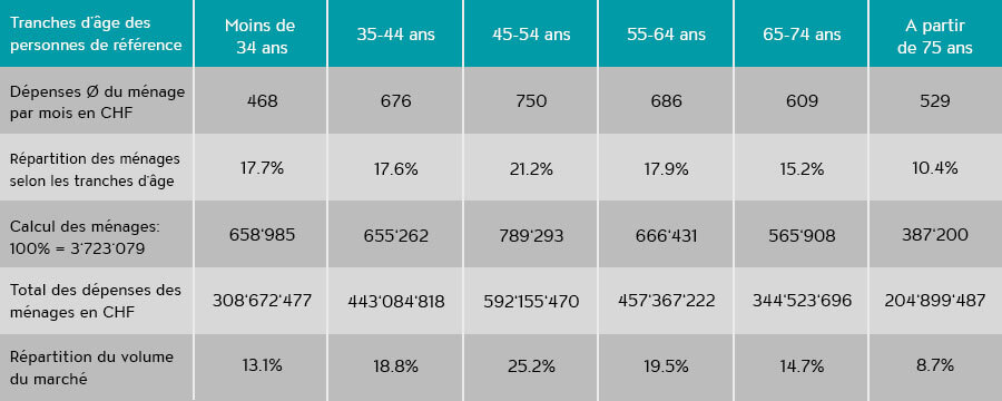 Un exemple tiré du secteur des FMCG (Fast Moving Consumer Goods) offre des résultats remarquables: en moyenne, les citoyen(ne)s suisses dépensent CHF 632.– par mois en nourriture et en boissons non alcoolisées. Les ménages composés de personnes plus jeunes (personne de référence âgée de 34 ans maximum) dépensent CHF 468.– par mois dans cette catégorie de produits, soit environ un tiers de moins que la moyenne. Avec CHF 750.–, les ménages composés de personnes âgées de 45 à 54 ans disposent du budget le plus élevé. La deuxième place revient aux ménages constitués de personnes âgées entre 55 et 64 ans, dont les dépenses mensuelles en produits de grande consommation (FMCG) s’élèvent à CHF 686.– (voir ill. 1). Si l’on réunit ces deux principales tranches d’âge, on obtient le groupe cible économiquement dominant des 45-64 ans.