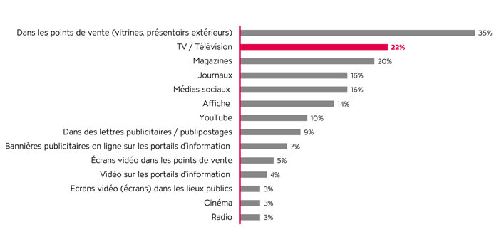 Traditionnellement, les acheteur·euse·s trouvent principalement leurs idées cadeaux dans les points de vente. C’est en tout cas ce qu’ont indiqué 35% des personnes interrogées. Outre les marchés de Noël et les détaillants, la publicité reste une source d’inspiration très importante. La télévision, en particulier, est citée par 22% des participant·e·s comme la première source d’idées d’un point de vue médiatique (voir ill. 1).