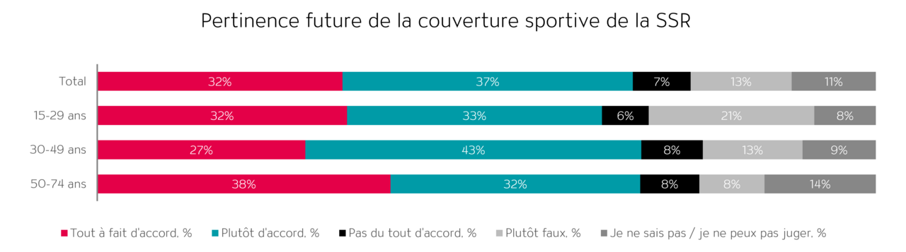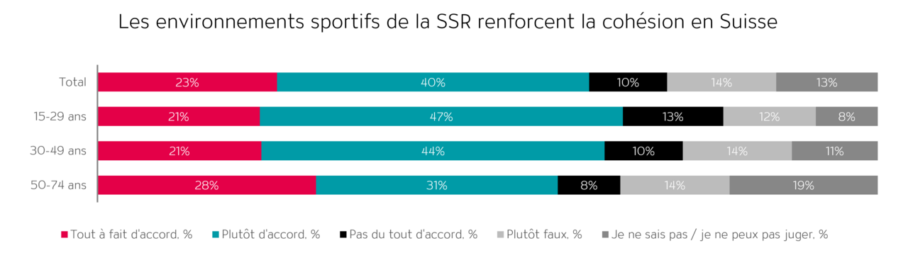 En outre, les retransmissions sportives contribuent à renforcer la cohésion et la compréhension entre les différentes régions linguistiques (63% d’approbation). Il est particulièrement intéressant de noter que cette conviction est encore plus forte chez les jeunes âgés de 15 à 29 ans (68%).