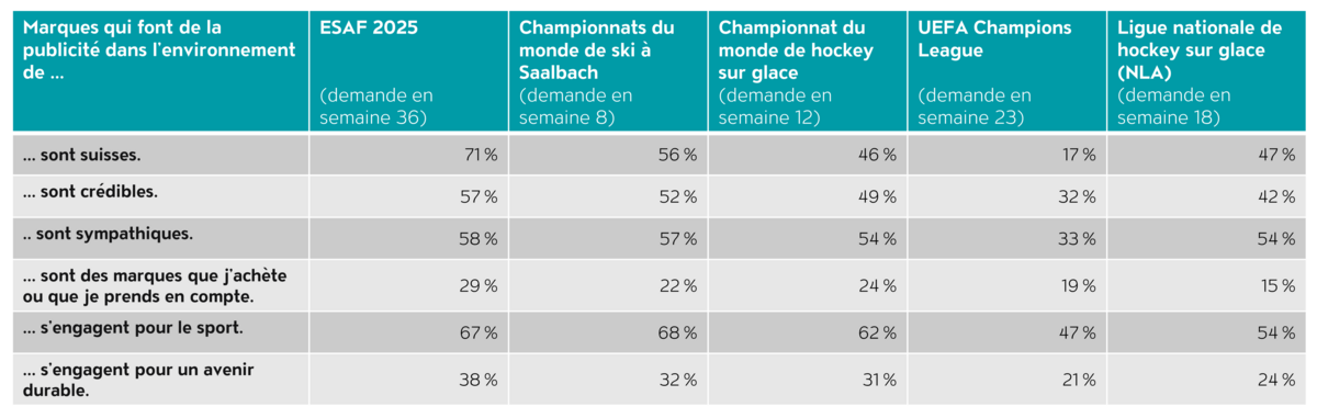 En ce qui concerne l’identité suisse, la FFLS 2025 se démarque avec 71% d’approbation. Avec 17%, la ligue des champions UEFA est considérée comme la moins suisse. Les associations avec la crédibilité entre les événements et les marques publicitaires sont les plus élevées dans l’environnement de la FFLS (57%), suivi des Championnats du monde de ski (52%) et les plus faibles dans la ligue des champions UEFA (32%).