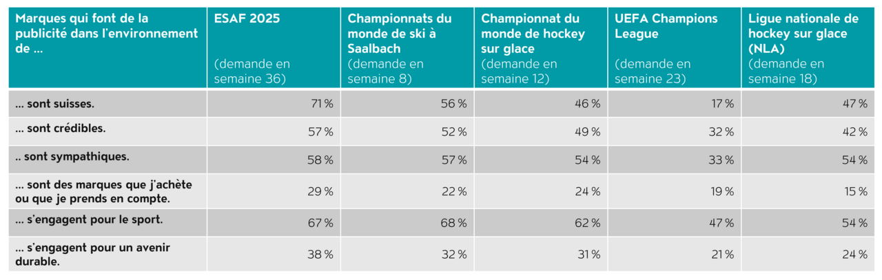 L’étude démontre un transfert de valeurs positif: les marques qui font de la publicité dans des environnements sportifs de qualité bénéficient d’associations fortes, notamment en termes d’identité suisse, de crédibilité et d’engagement (voir ill. 6).