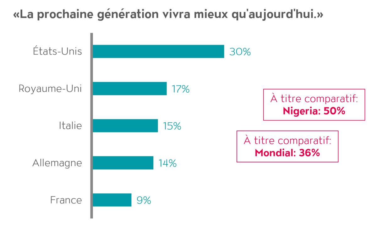 Le scepticisme général se traduit également par un manque d’optimisme pour l’avenir. Dans le monde, seulement 36% des personnes interrogées pensent que la prochaine génération ira mieux que celle d’aujourd’hui. Dans la plupart des pays industrialisés, cette valeur est encore plus basse: par exemple, seulement 9% en France, 14% en Allemagne, 15% en Italie, 17% au Royaume-Uni et 30% aux États-Unis sont optimistes pour la prochaine génération. En revanche, dans des pays comme le Nigeria, l’optimisme est plus élevé avec 50%.
