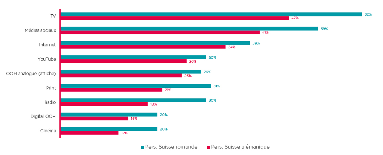 La télévision atteint également le taux d’attention publicitaire le plus élevé pour les produits et services durables. Tous les autres canaux médiatiques ont reçu une attention nettement plus faible dans les deux régions. En Suisse romande, ce sont les réseaux sociaux qui arrivent en deuxième position avec 32% de perception.