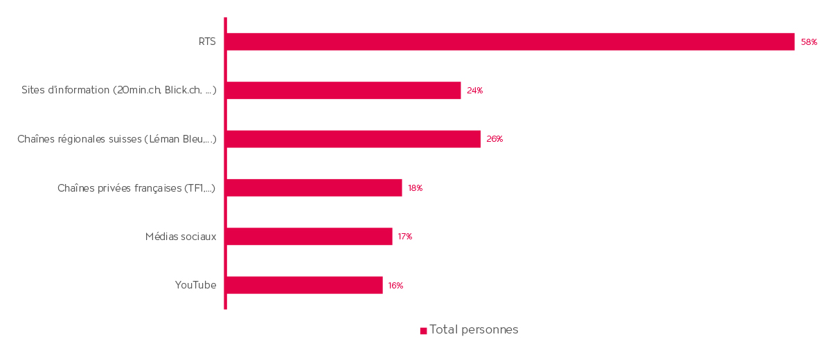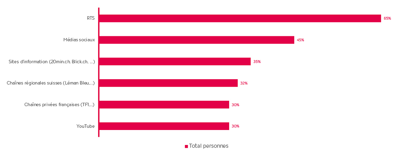 En Suisse romande, la RTS bénéficie d’un taux de confiance tout aussi élevé (58%), suivie par tous les autres canaux, qui ne dépassent pas les 25%. En Suisse, c’est donc à la télévision publique qu’est attribué le rôle le plus important du panorama audiovisuel en matière de gestion de la durabilité.