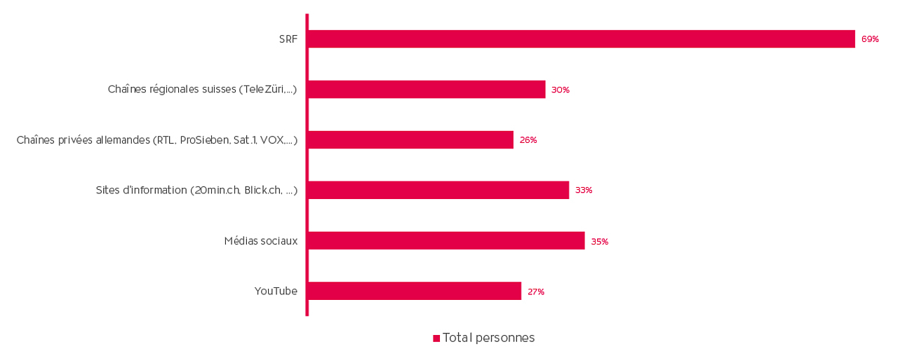 Dans les deux régions linguistiques, la transmission d’informations sur la durabilité passe principalement par les chaînes de la SSR. En Suisse alémanique, avec 69%, la SRF dépasse très largement les autres canaux. Les chaînes régionales, les chaînes privées, les sites d’information, les réseaux sociaux et YouTube occupent une place secondaire pour ce qui est des informations sur la durabilité, et ce dans les deux régions.