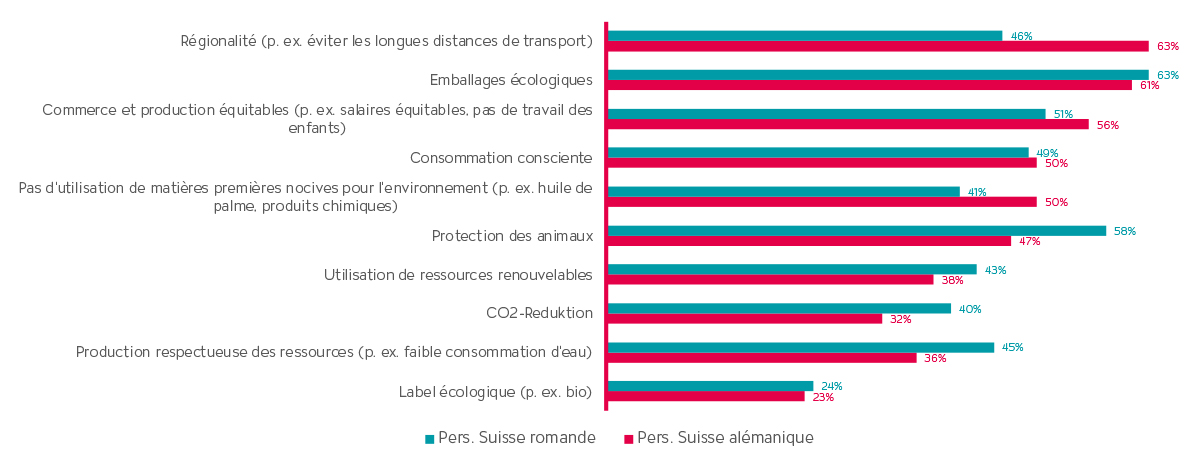 En Suisse alémanique, le caractère local, les emballages respectueux de l’environnement et les conditions de production et de commerce équitables sont considérés comme les aspects les plus importants de la durabilité. En Suisse francophone, la protection animale joue également un rôle clé. Dans les deux régions, près de la moitié des personnes interrogées indiquent veiller à adopter un mode de consommation responsable et à éviter les matières premières néfastes pour l’environnement. Les labels écologiques (p. ex. le bio) n’occupent qu’une place secondaire.