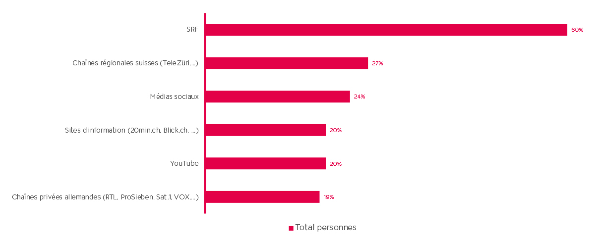 Outre la transmission d’informations sur la durabilité, aucun autre canal médiatique ne bénéficie d’une confiance et d’un taux d’approbation aussi élevés que les chaînes de la SSR en ce qui concerne leur contribution en faveur de la durabilité et de l’environnement. En Suisse alémanique, 60% des personnes participant à l’étude accordent leur confiance aux chaînes de la SSR. Les chaînes régionales, les réseaux sociaux, les sites d’information, YouTube et les chaînes privées allemandes atteignent un taux d’approbation deux à trois fois inférieur.