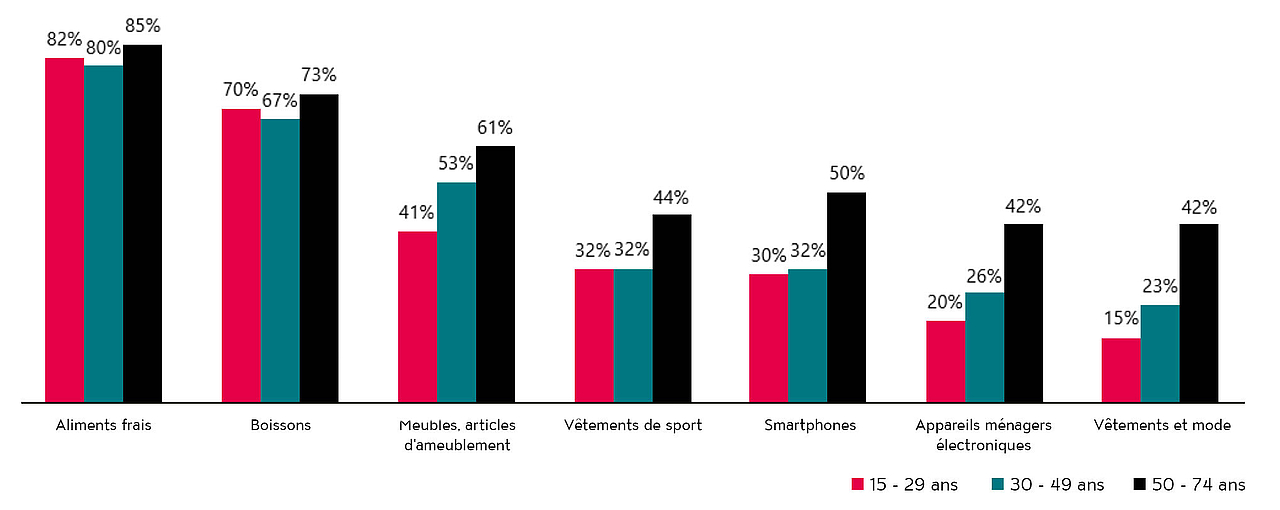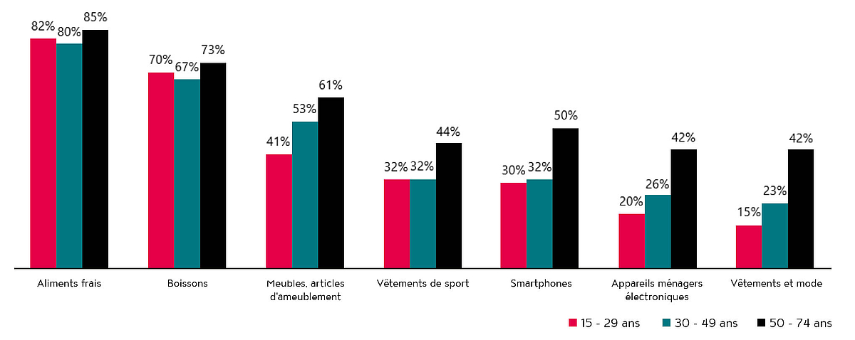 Par exemple, une personne sur trois souhaiterait acheter des vêtements de sport et des smartphones dans des magasins traditionnels afin de bénéficier des conseils d’un spécialiste. Dans ces deux catégories de produits, il est également clair que les personnes âgées préfèrent nettement les magasins traditionnels. L’hypothèse selon laquelle le comportement d’achat va complètement migrer vers les canaux numériques reste donc plutôt irréaliste pour de nombreuses catégories de produits.