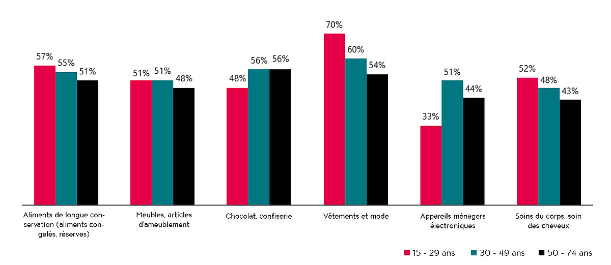 Outre l’attention portée à la publicité, qui reste une constante fiable pour la planification du marketing, le commerce traditionnel reste pertinent. 82% des personnes interrogées déclarent vouloir continuer à acheter des aliments frais dans des magasins traditionnels. Cette affirmation claire est confirmée de la même manière dans tous les groupes d’âge. Cependant, les préférences de canal pour acheter changent selon la catégorie de produits.