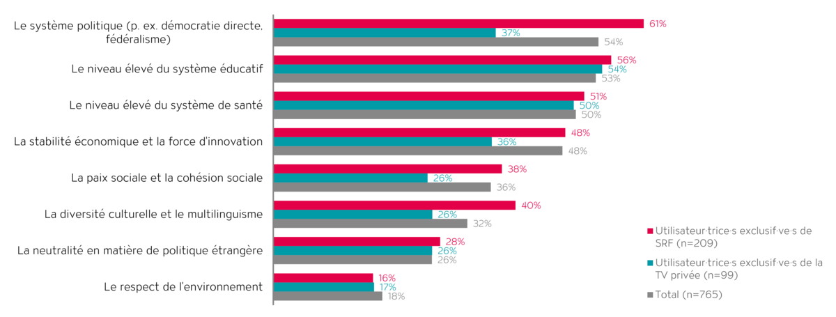 Les personnes sont interrogées sur les points forts de la Suisse et les résultats sont parfois très différents en fonction de la consommation TV. Le système politique, le système d’éducation et de santé ainsi que la stabilité économique et la capacité d’innovation sont particulièrement cités. Avec 61%, les utilisateur·trice·s exclusif·ve·s de la SRF sont nettement plus nombreux·ses à considérer le système politique comme la force du pays que celles et ceux des chaînes privées (37%). Ils font ainsi preuve d’une plus grande confiance dans le système. Le public de la SRF perçoit également beaucoup plus souvent la cohésion sociale et la diversité culturelle comme un enrichissement. Dans l’évaluation de la stabilité économique et du système de santé, les points de vue des différents groupes sont certes plus proches les uns des autres, mais le groupe SRF aura également tendance à afficher des taux d’opinions favorables plus élevés dans ces domaines (voir ill. 2).