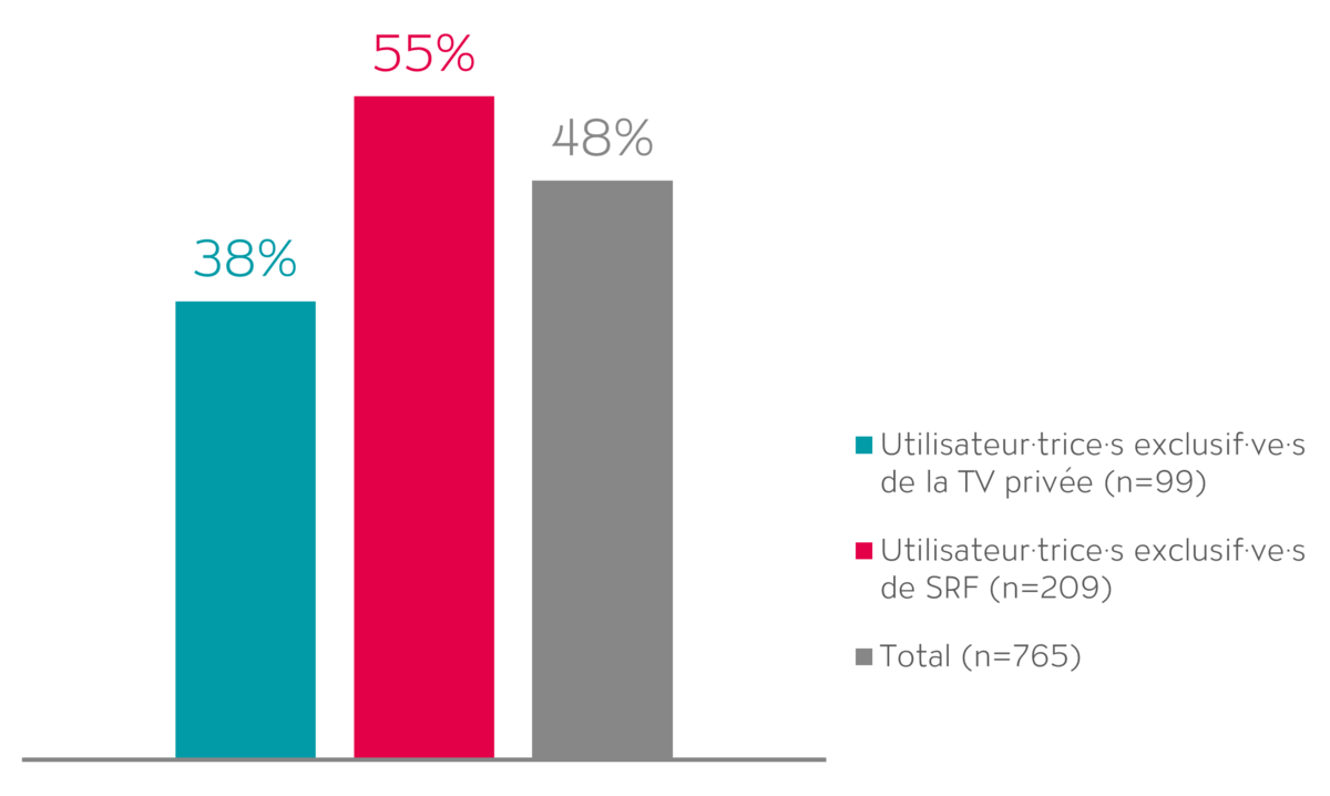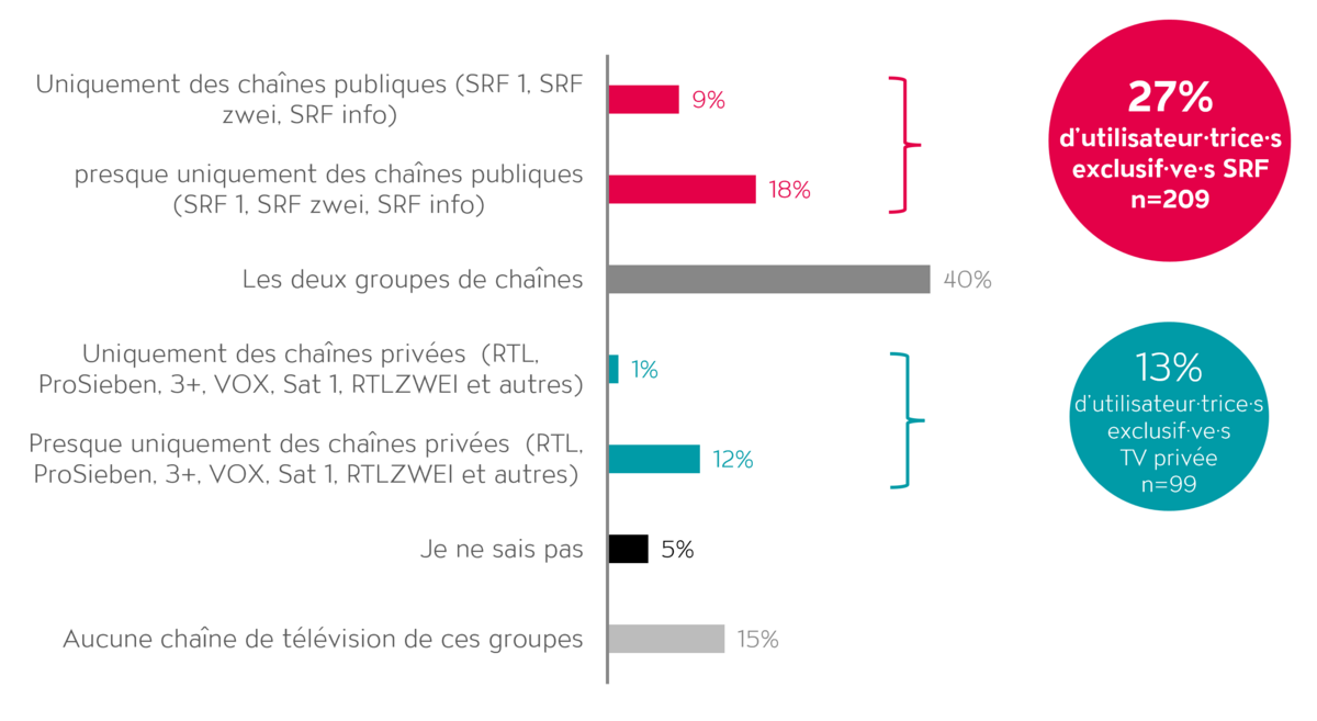 Le paysage télévisuel suisse est principalement divisé en deux groupes: les chaînes publiques de la SSR et les chaînes privées. De nombreuses personnes utilisent les deux offres. Toutefois, une partie de la population préfère et consomme exclusivement ou presque uniquement l’une des deux familles de chaînes. Nous les appelons les utilisateur·trice·s exclusif·ve·s.