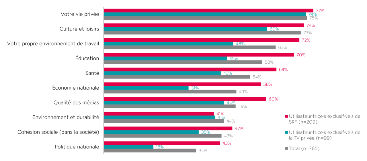 On constate ici une différence intéressante entre les groupes d’utilisateur·trice·s: dans presque tous les domaines étudiés, les utilisateur·trice·s exclusif·ve·s de la SRF se disent plus satisfait·e·s que le public qui ne consomme que des chaînes privées. Tandis que la satisfaction dans le domaine personnel se situe à un niveau élevé similaire dans les deux groupes, l’écart est important pour les sujets de société.