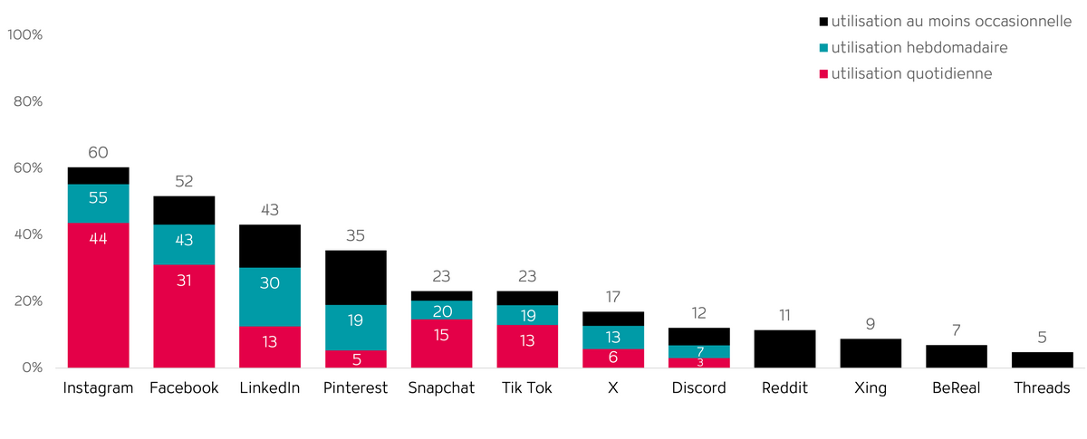 Lorsque l’on consulte l’utilisation des réseaux sociaux, l’IGEM Digimonitor permet de disposer d’une bonne base pour évaluer la pertinence des différents réseaux en termes de planification média. Par exemple, Instagram affiche un taux de pénétration hebdomadaire de 55% (fig. 1).