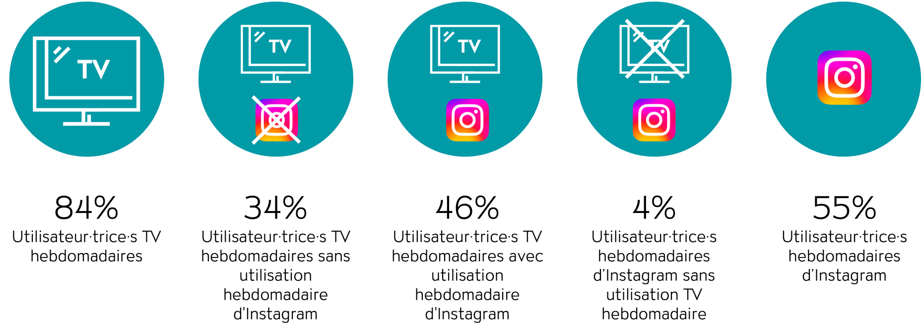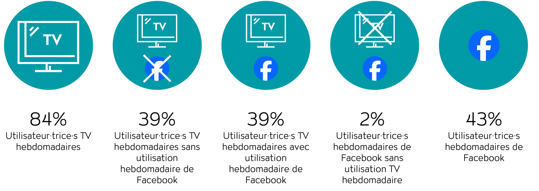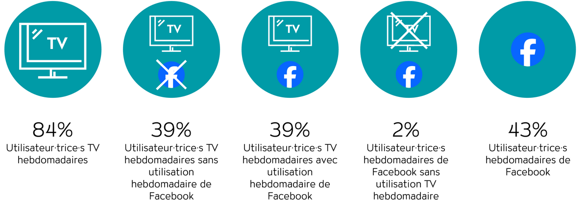 Avec un taux de pénétration hebdomadaire total de 43%, Facebook est une plateforme moins puissante qu’Instagram. Par conséquent, la stratégie d’un contact TV complété par des contacts Facebook en aval ne permet d’atteindre que 39% de portée hebdomadaire potentielle (15-74 ans). Toutefois, Facebook reste une plateforme tout à fait intéressante avec seulement 5% de pertes par dispersion qui ne peuvent pas être couvertes par un contact TV en amont (fig. 3).