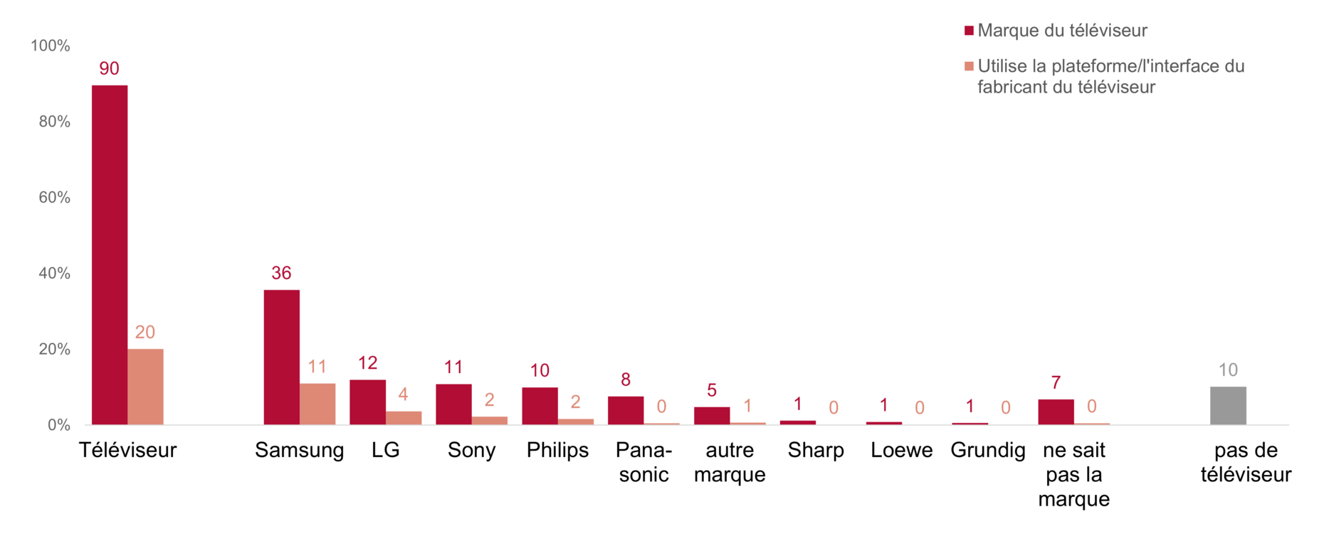 Samsung domine en tant que marque TV dans les ménages suisses, suivie par LG et Sony. Dans certains pays européens, Samsung commercialise déjà des espaces publicitaires sur l’interface de démarrage de ses téléviseurs. Il s’agit généralement d’un inventaire d’affichages. Cependant, en Suisse, l’utilisation de décodeurs (p. ex. Swisscom ou Sunrise, etc.) est très répandue, de sorte que l’interface propre aux téléviseurs est peu utilisée. Bien que 36% des ménages disposent d’un téléviseur Samsung, seul un tiers d’entre eux (11%) utilisent également le «Smart Hub», la plateforme de contenu de Samsung (voir ill 5). La distribution existante en Suisse le confirme, mais avec une pénétration encore faible de la télévision connectée.