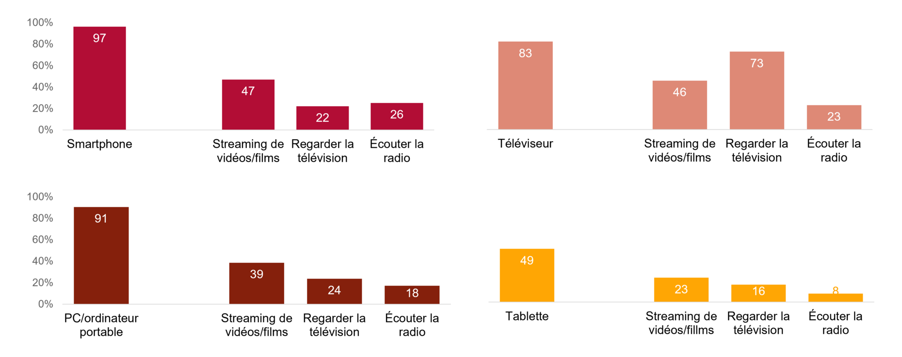 L’utilisation des médias varie considérablement d’un appareil à l’autre. La télévision classique concerne généralement le grand écran, c’est-à-dire le téléviseur, avec une utilisation hebdomadaire pour 73% des personnes interrogées. La TV est moins regardée sur de petits écrans. Pour le streaming de vidéos et de films, le public est plus flexible dans le choix de l’appareil. Les smartphones (47%) et les téléviseurs (46%) arrivent presque à égalité tandis que les PC et ordinateurs portables (39%) sont également appréciés. Dans l’ensemble, la tablette est la moins utilisée par rapport aux autres écrans pour presque toutes les activités médiatiques (voir ill. 1).