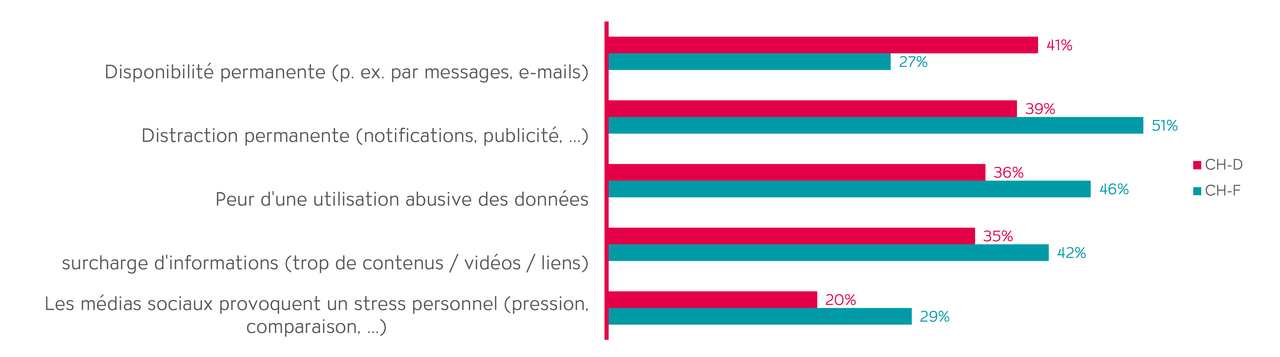 On voit nettement, surtout en Suisse alémanique, que cette joignabilité permanente causée par Internet et les distractions incessantes qui en découlent comme les messages, les e-mails, etc., provoquent en général une saturation. Par ailleurs, en Suisse romande, près de la moitié des personnes interrogées considère la peur d’une utilisation abusive de données comme un aspect important de la saturation. À cela s’ajoutent des flux d’informations et une pression personnelle sur les réseaux sociaux comme facteurs de cette saturation d’Internet (ill. 2).