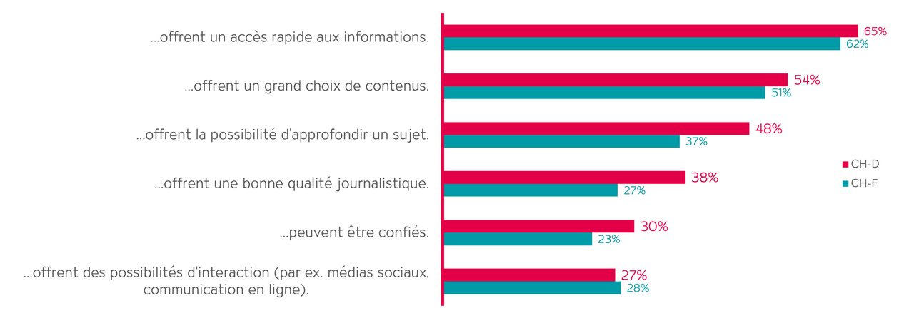 L’étude pose notamment cette question: quels aspects de l’utilisation des médias jouent un rôle important? Très clairement, pour les deux tiers des participant·e·s, il s’agit de l’accès rapide aux informations et pour un peu plus de la moitié, une vaste sélection de contenus compte beaucoup. Les possibilités d’interaction avec les médias sont considérées comme nettement moins importantes.