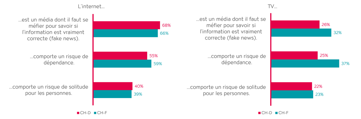 Les «Fake News» sont un vrai sujet d’actualité pour les personnes interrogées. Mais il y a tout de même des différences. Si l’on compare Internet et la télévision, près de 70% trouvent que sur Internet, il faut faire attention à la véracité de l’information, contre seulement 30% pour la télévision. Elle est donc considérée comme nettement plus fiable. Cela vaut aussi pour le danger de l’addiction: pour Internet il est bien plus élevé, surtout pour les répondant·e·s de Suisse alémanique. À un niveau moindre, l’isolement est lui aussi considéré comme plus probable en utilisant Internet que la télévision (Internet 40% vs TV 22%). Environ 50% de la population suisse confirme dans cette enquête que la télévision détend. Or, en Suisse alémanique, ils ne sont que 18% à l’affirmer pour Internet et 36% en Suisse romande.