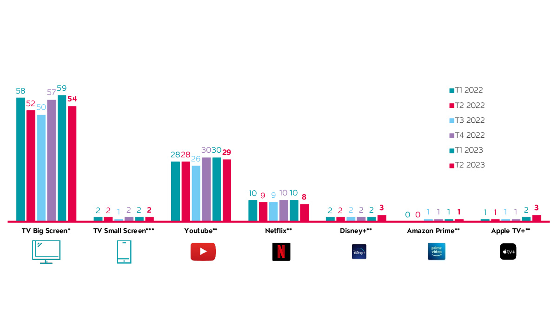 *Données TV Mediapulse, 01.04.2023 – 30.06.20233, durée d’utilisation, durée de visionnage, 24h, lun-dim, toutes les plateformes TV, Live + recorded View, utilisation à la maison, téléviseur