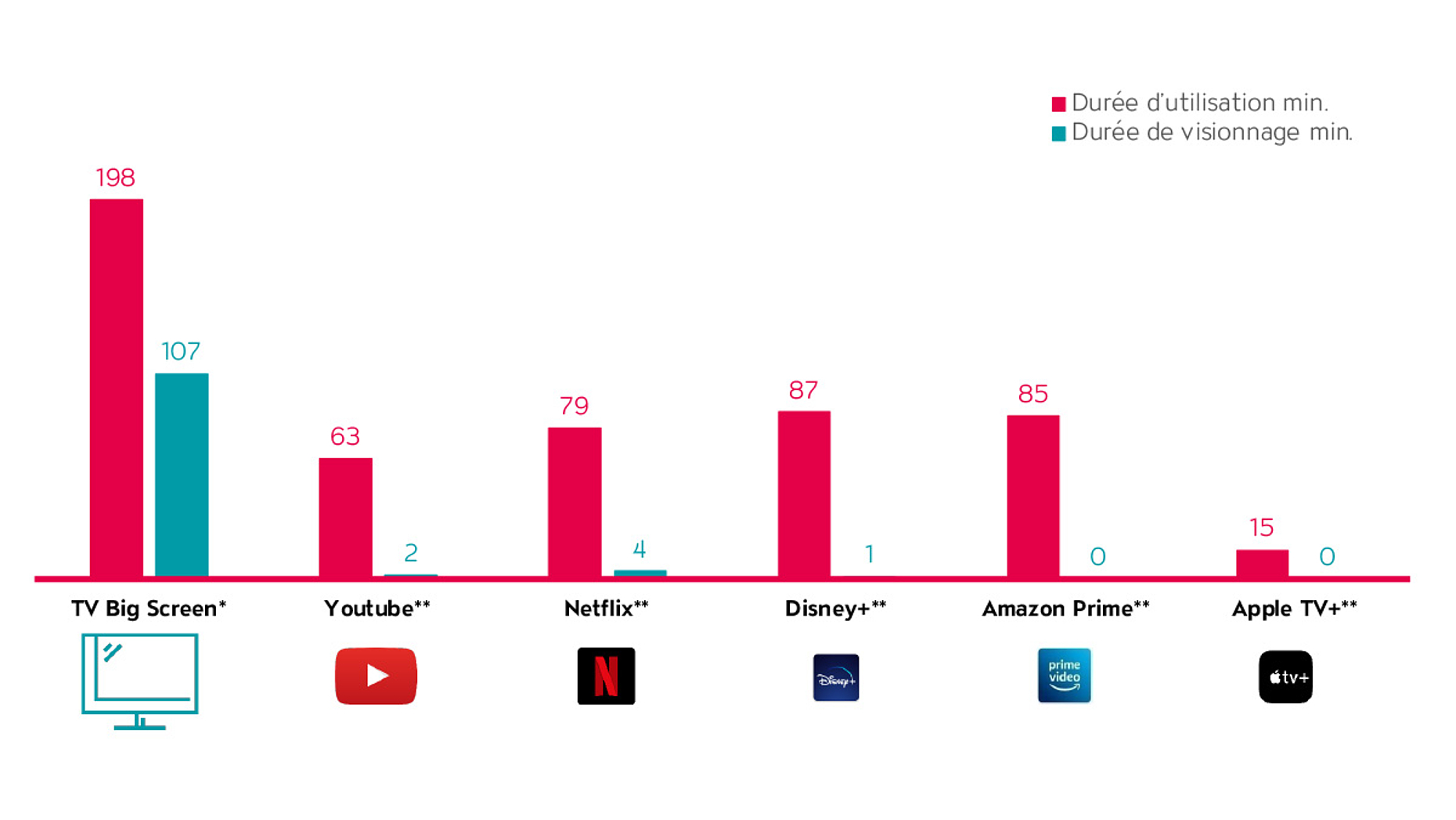 Ainsi, avec 2 minutes par personne, YouTube ne génère pratiquement pas de temps de visionnage sur grand écran. Pour ce faire, il manque une large base d’utilisateur·trice·s et leur volonté de consommer du contenu via ce canal sur grand écran pendant une période prolongée. En moyenne, les utilisateur·trice·s ne regardent YouTube que 63 minutes sur grand écran. La TV, elle, atteint un nombre impressionnant de 198 minutes par utilisateur·trice·s en termes de durée d’utilisation – c’est-à-dire de disposition à se plonger longtemps dans le contenu – ce qui permet un placement publicitaire efficace. La durée d’utilisation par personne et par jour est donc trois fois plus élevée à la télévision que sur YouTube.