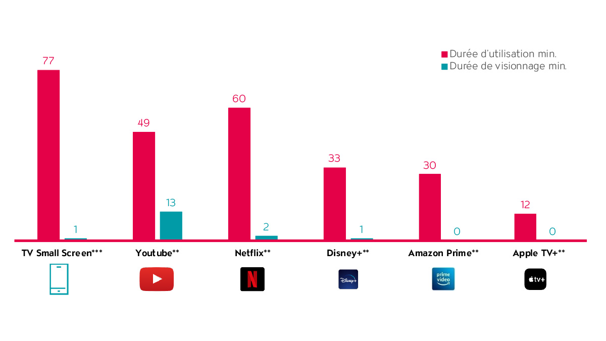 Sur les petits écrans, YouTube s’en sort mieux. Sur les 17,7 minutes par personne et par jour d’utilisation de petits écrans (durée de visionnage), 13 minutes sont consacrées à YouTube. YouTube dispose ici d’une base d’utilisateur·trice·s plus importante, ce qui entraîne une durée de visionnage plus longue. La durée d’utilisation par utilisateur·trice de 49 minutes est inférieure à la moyenne sur YouTube, mais aussi sur petit écran.