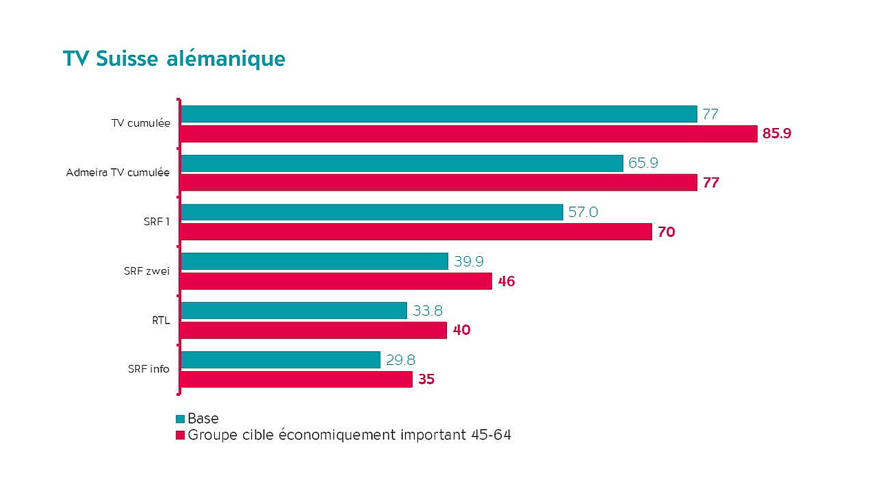 Les résultats montrent la puissance du média TV. En Suisse alémanique, la télévision touche environ 77% des personnes au moins «plusieurs fois par semaine» et en Suisse romande, cette proportion s’élève à environ 81%. Cette valeur n’est dépassée que par les services Web et les applications. Dans le groupe cible ROI des 45-64 ans mentionné ci-dessus, 86% des personnes en Suisse alémanique et 88% en Suisse romande sont même atteints plusieurs fois par semaine.