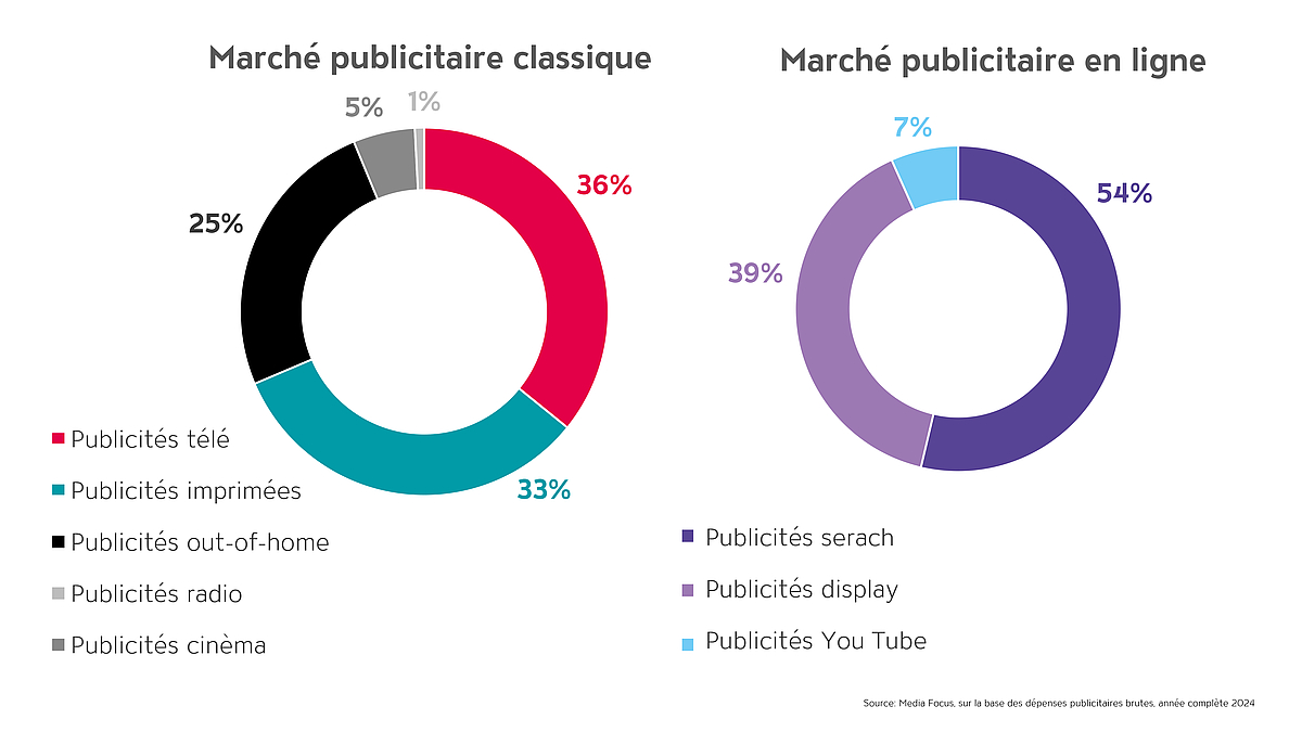 Dépenses publicitaires: dans la comparaison intermédias, l’une des dépenses publicitaires les plus importantes en Suisse en 2024, soit 36%, a été placée dans la catégorie TV.