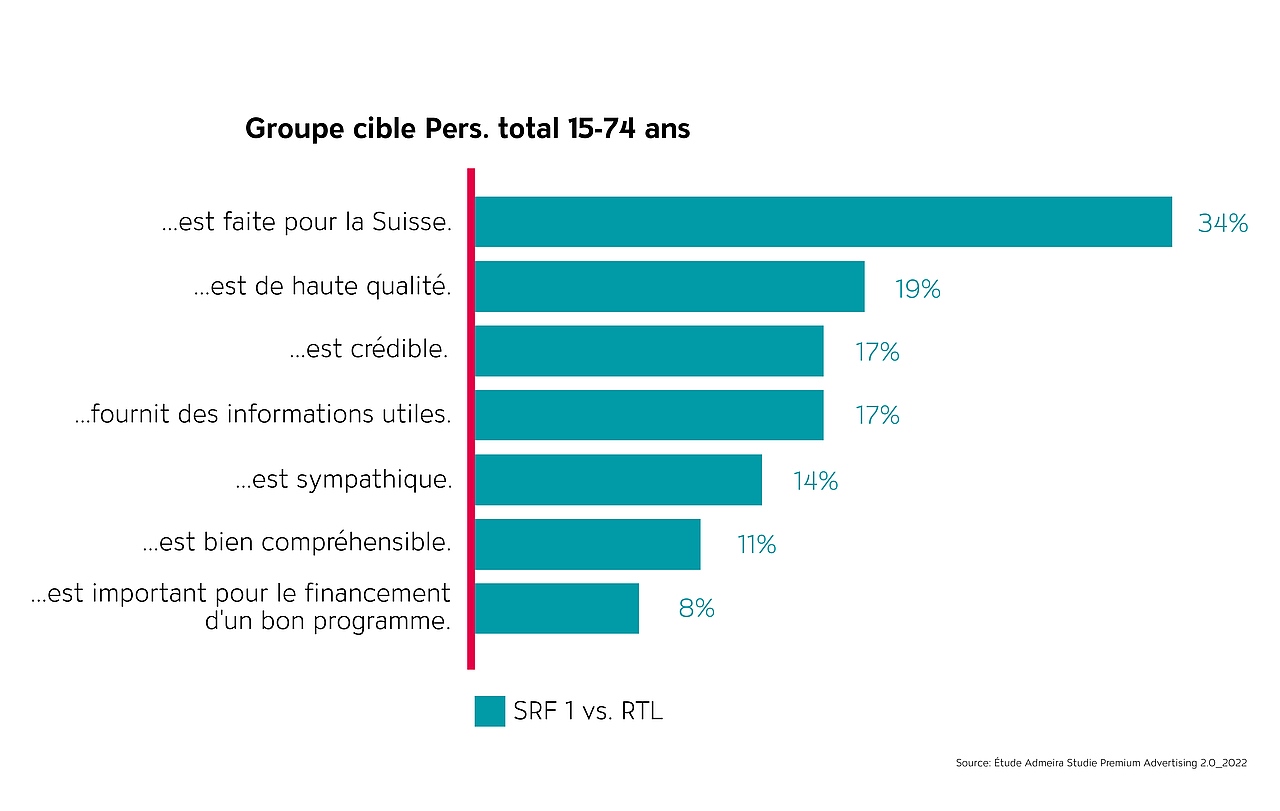 Environnement de programme: la SSR est réputée pour proposer des programmes de grande qualité. Une publicité placée dans un environnement qualitatif profite également de cette perception positive, ce qui augmente l’efficacité du message publicitaire (voir l’étude «Transfert de Valeur»).