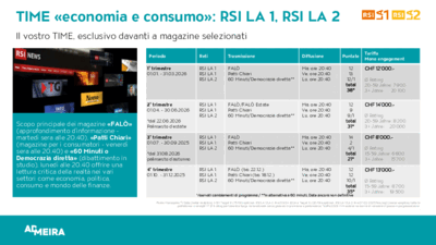 Il vostro spot TIME di dieci secondi verrà collocato immediatamente prima delle rivista su RSI LA 1 e RSI LA 2 garantendo al vostro spot la massima attenzione del pubblico.