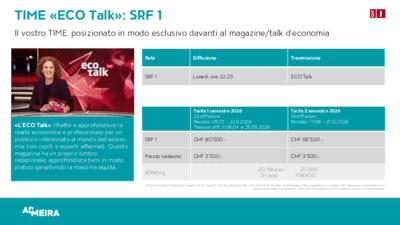 Il vostro spot TIME di dieci secondi verrà collocato immediatamente prima del Business Talk su SRF 1 garantendo al vostro spot la massima attenzione del pubblico.