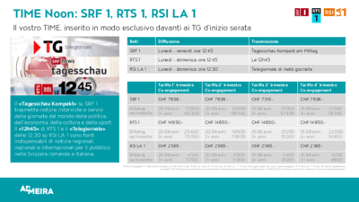 Il vostro spot TIME di dieci secondi verrà collocato immediatamente prima degli importanti programmi d'informazione su SRF 1, RTS 1 e RSI LA 1 garantendo al vostro spot la massima attenzione del pubblico.