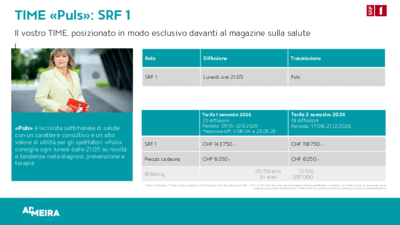 Il vostro spot TIME di dieci secondi verrà collocato immediatamente prima delle rivista sulla salute su SRF 1, RTS 1 e RSI LA 1 garantendo al vostro spot la massima attenzione del pubblico.