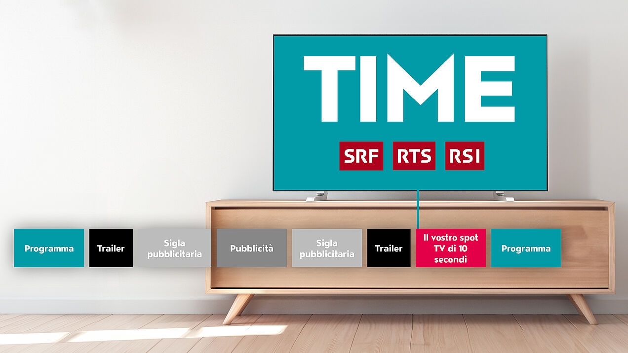 TIME è il nostro formato pubblicitario televisivo speciale ed esclusivo per i canali della SRG, che consente diraggiungere la massima credibilità e attenzione nei confronti del vostro spot. Oltre ad andare in onda subitoprima dei programmi e a un raggio d’azione elevatissimo, TIME garantisce anche le maggiori quote di mercato. Tutto questo si traduce per voi nella massima efficacia possibile.