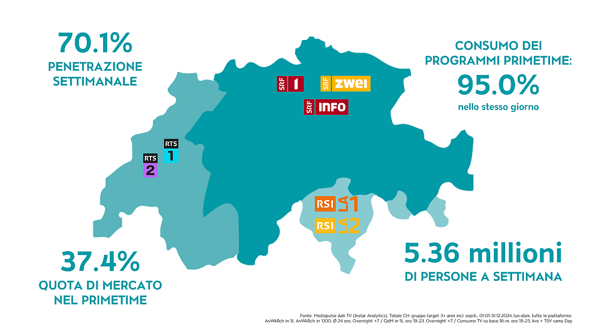 Penetrazione: le emittenti della SRG raggiungono buona parte della popolazione in tutte le regioni e in tutte le lingue nazionali della Svizzera. È quindi possibile realizzare campagne pubblicitarie non solo per determinate regioni linguistiche, ma anche a livello nazionale.