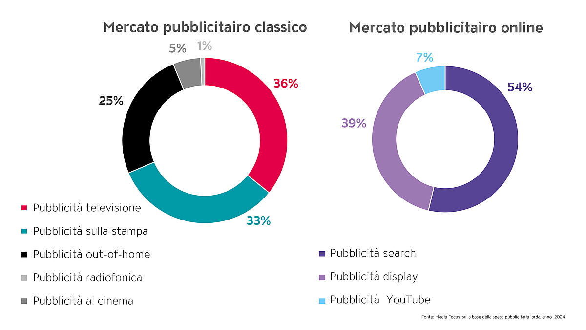 Spese pubblicitarie: dal raffronto intermediale è emerso che in Svizzera, nel 2024, tra le maggiori spese pubblicitarie si annoverano quelle destinate alla categoria TV (36%).