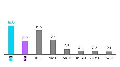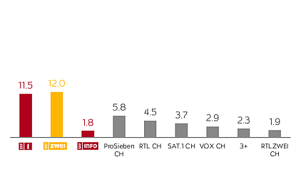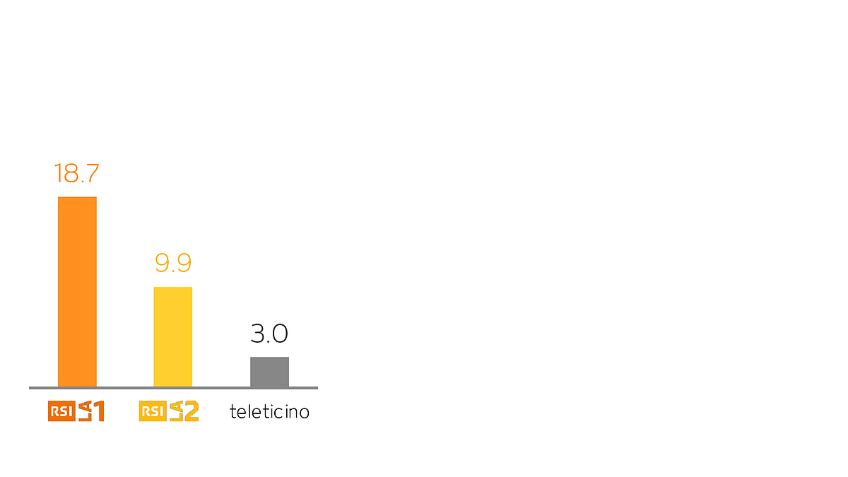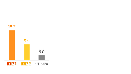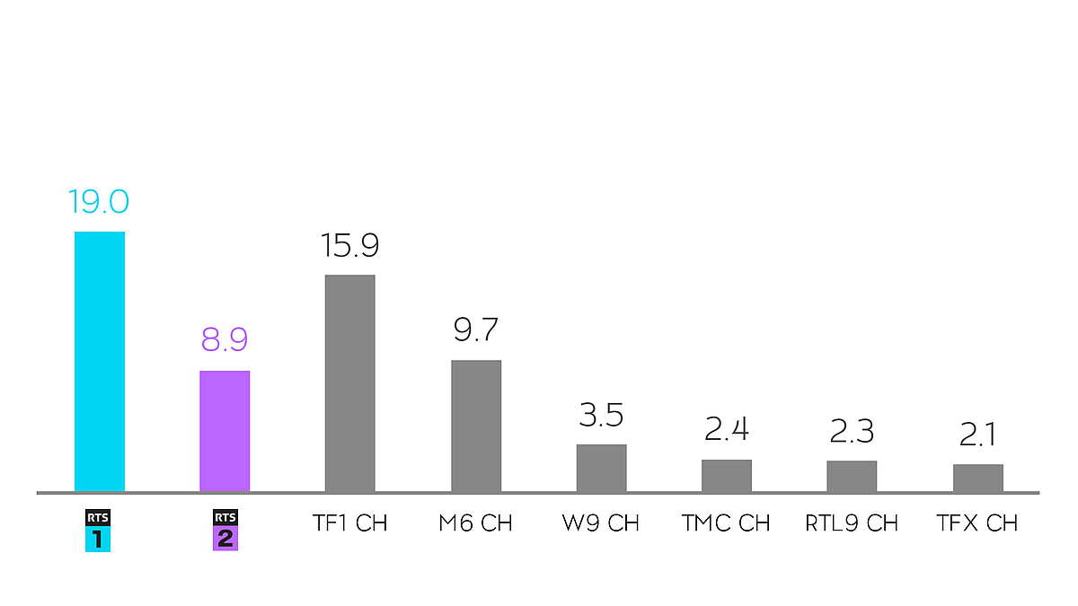 Le emittenti del servizio pubblico televisivo svizzero (SRG SSR), commercializzate da Admeira, sono leader del mercato in Svizzera tra i giovani. Nel gruppo target di età compresa tra i 15 e i 29 anni, SRF 1 nella Svizzera tedesca e RTS 1 nella Svizzera occidentale raggiungono le quote di mercato più elevate nel Primetime, superando nettamente le emittenti private nelle regioni.**