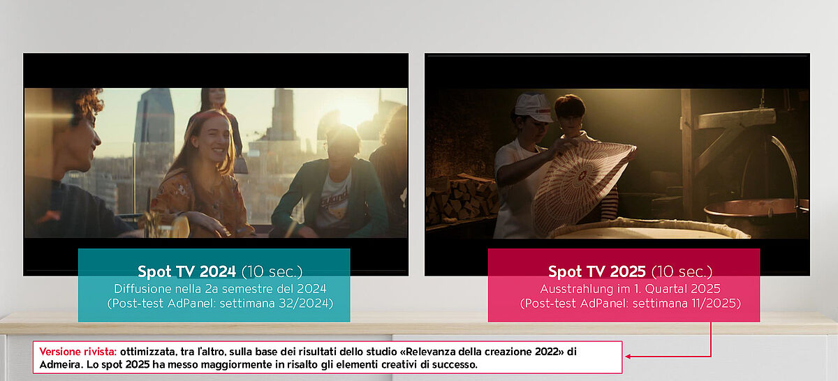 Nell’ambito dell’AdPanel sono stati analizzati due spot di Emmentaler DOP trasmessi in periodi di tempo diversi nella Svizzera tedesca. Tra le due ondate, lo spot pubblicitario è stato ottimizzato in modo mirato. Gli adattamenti si sono basati, tra le altre cose, sui risultati emersi dallo studio di Admeira «Rilevanza della creazione di spot». Questo studio dimostra che gli spot che integrano l’immaginario visivo svizzero (Swissness) ottengono valutazioni nettamente migliori rispetto a quelli privi di tale riferimento.2 Sulla base di questi dati, nel 2025 lo spot ha posto maggiormente in primo piano elementi creativi di successo come l’origine e la tradizione.