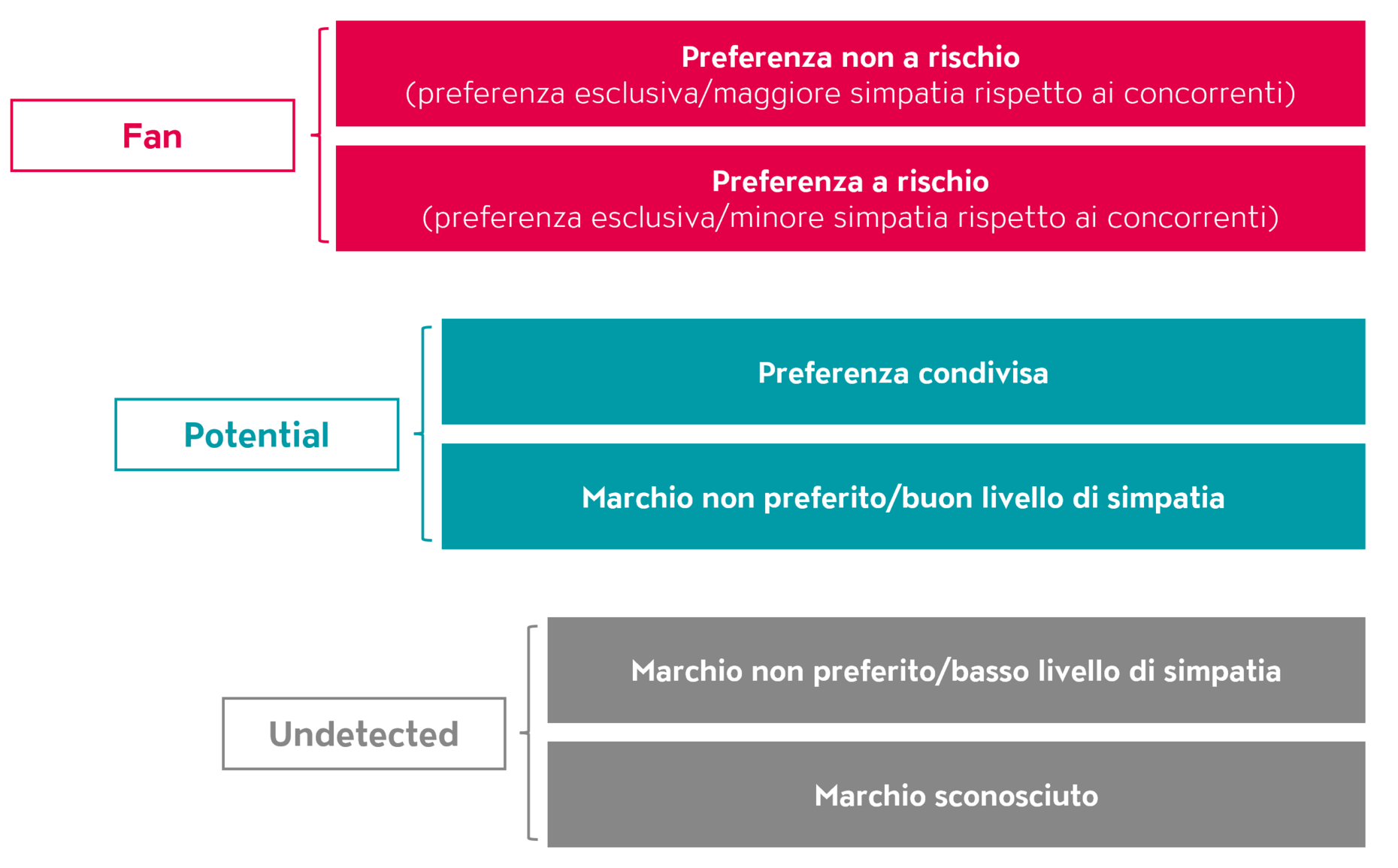 I risultati di Admeira Adpanel in merito alla posizione del marchio costituiscono una base decisiva per una pianificazione mediatica strategica e basata sui dati. Analizzando le risposte a domande specifiche nei post-test di AdPanel, otteniamo informazioni preziose sul rapporto dei consumatori con il marchio. Le domande sulla preferenza per un marchio («Ipotizziamo che acquisti uno di questi prodotti / approfitti di una di queste offerte, quale marchio sceglierebbe?») e sulla simpatia per il marchio («Quanto le sta simpatico/a il seguente marchio o azienda?») consentono di suddividere le persone intervistate in tre categorie principali: Fan, Potential e Undetected. Per ottenere un quadro ancora più differenziato della fedeltà al marchio, ciascuna di queste categorie può essere suddivisa in due sottocategorie (Fig. 1).