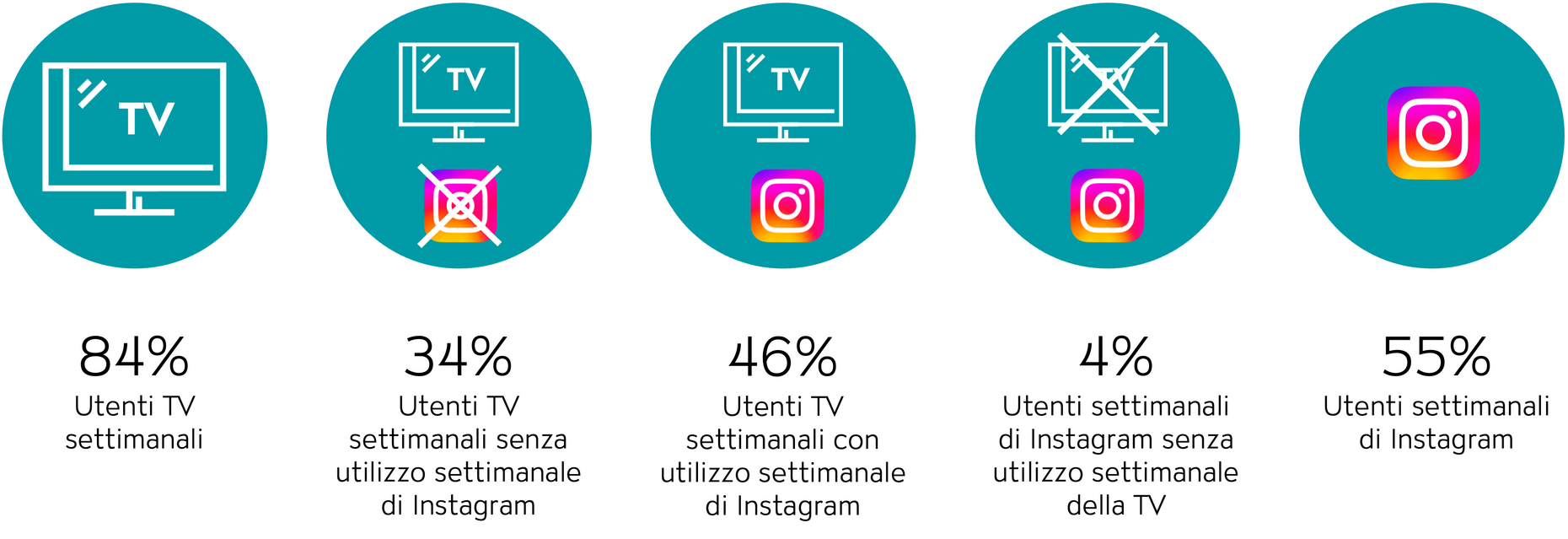 Tra i gruppi target giovani (15-34 anni), grazie alla maggiore penetrazione di Instagram (penetrazione settimanale del 79%) il potenziale della strategia TV+Instagram è ancora più alto: penetrazione settimanale del 59% nella sovrapposizione. Tuttavia, aumenta anche il rischio di contatti Instagram inefficaci per il 20% del gruppo target (contatti Instagram che non possono essere supportati da un contatto TV).