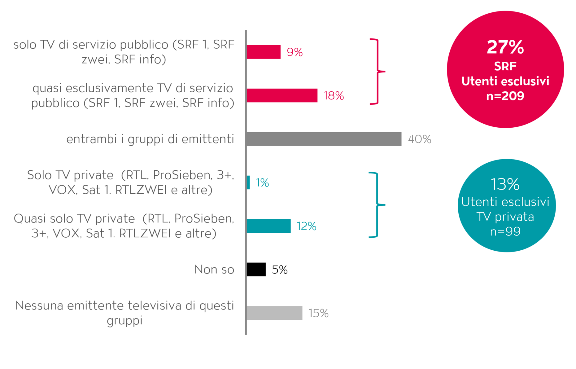 - Il 40% guarda entrambi i gruppi di emittenti (pubbliche e private).
