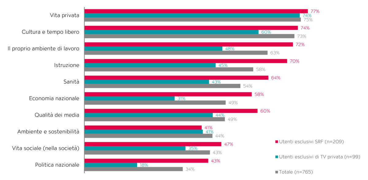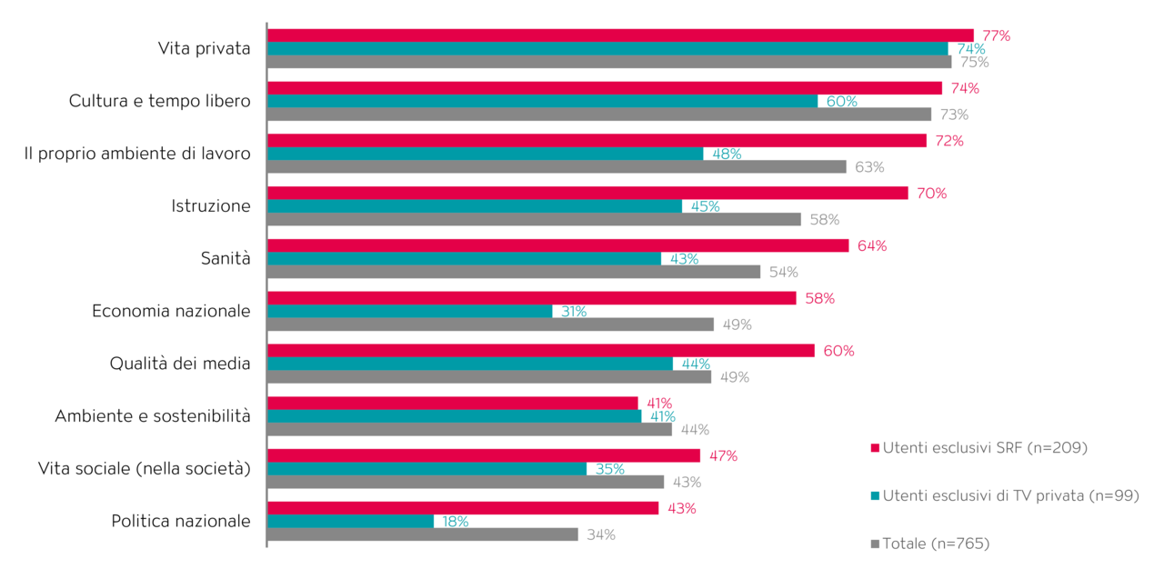 Qui emerge un’interessante differenza tra i gruppi di utenti: gli utenti esclusivi della SRF sono più soddisfatti in quasi tutti i settori oggetto del sondaggio rispetto al pubblico delle emittenti private. Mentre la soddisfazione per le questioni personali si attesta quindi a un livello analogo per entrambi i gruppi, il divario per quanto riguarda le tematiche sociali si allarga notevolmente.